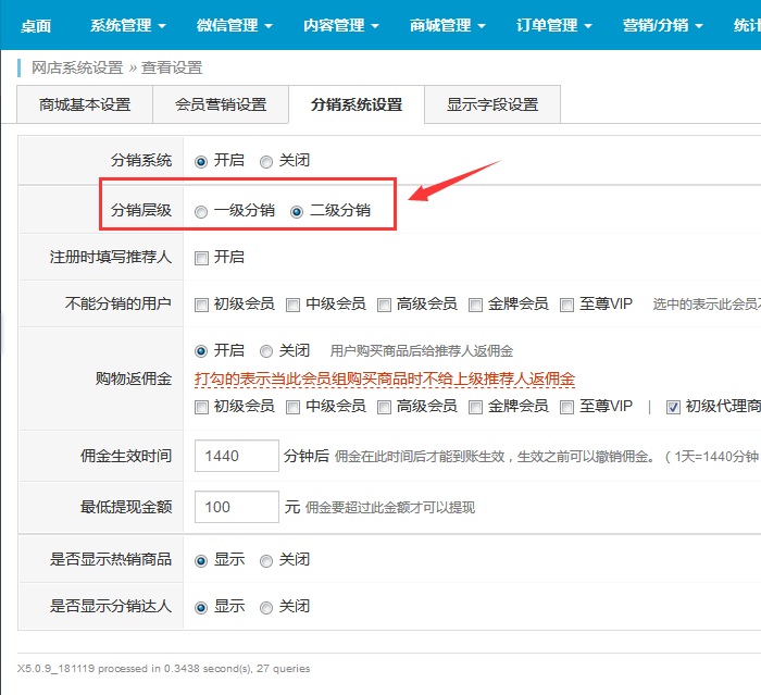 考慮到微信封殺三級分銷原因,商城系統設置里可以自由選擇設置是一級還是二級分銷。