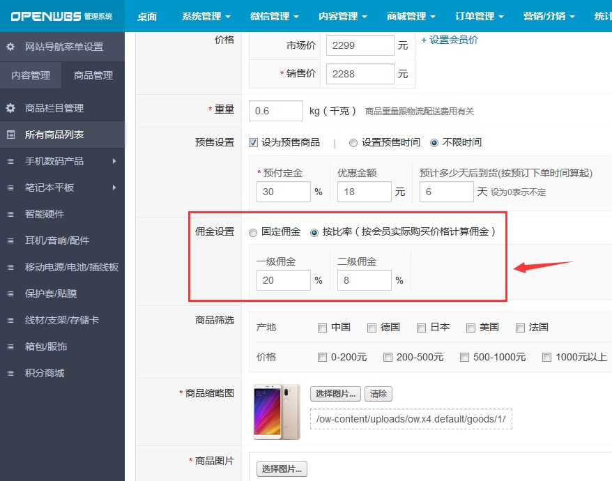 商品分銷傭金設置: