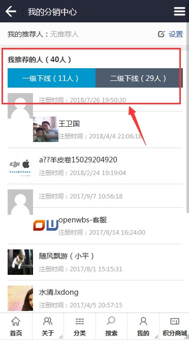 會員前臺手機端分銷下線列表和統計: