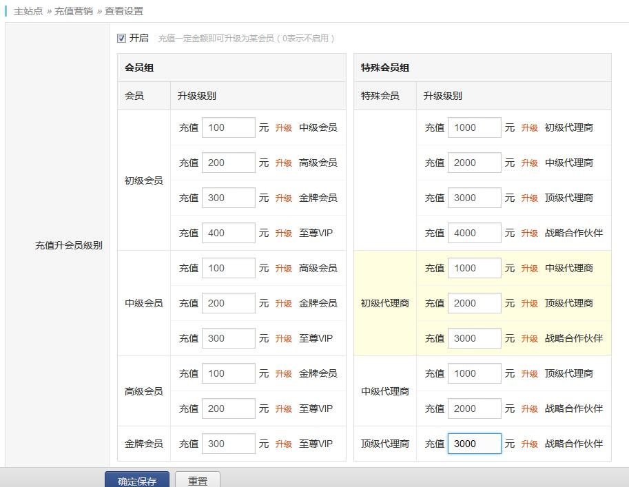 經常用在充值營銷中,會員在會員中心在線充值xx元可以自動升級為某會員級別。